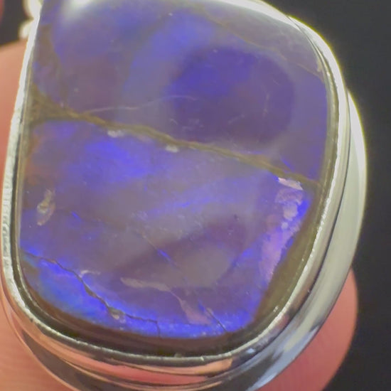 This exquisite pendant showcases a hand-polished piece of Ammolite, one of the rarest gemstones on Earth. Sourced from the fossilized remains of extinct Ceptahlopods (Ammonites) found in the Bearpaw Formation, this organic gemstone is celebrated for its breathtaking iridescence. Each stone acts as a natural prism, displaying a vibrant "flash" of color that has been preserved for over 70 million years. Expertly mounted in a minimalist .925 Sterling Silver frame, the setting is designed to remain subtle, ensuring the focus remains entirely on the gemstone’s prehistoric brilliance and unique geological story.