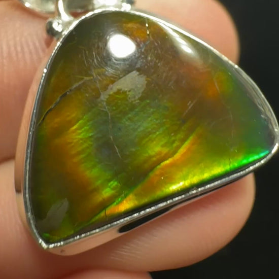 This exquisite pendant showcases a hand-polished piece of Ammolite, one of the rarest gemstones on Earth. Sourced from the fossilized remains of extinct Ceptahlopods (Ammonites) found in the Bearpaw Formation, this organic gemstone is celebrated for its breathtaking iridescence. Each stone acts as a natural prism, displaying a vibrant "flash" of color that has been preserved for over 70 million years. Expertly mounted in a minimalist .925 Sterling Silver frame, the setting is designed to remain subtle, ensuring the focus remains entirely on the gemstone’s prehistoric brilliance and unique geological story.