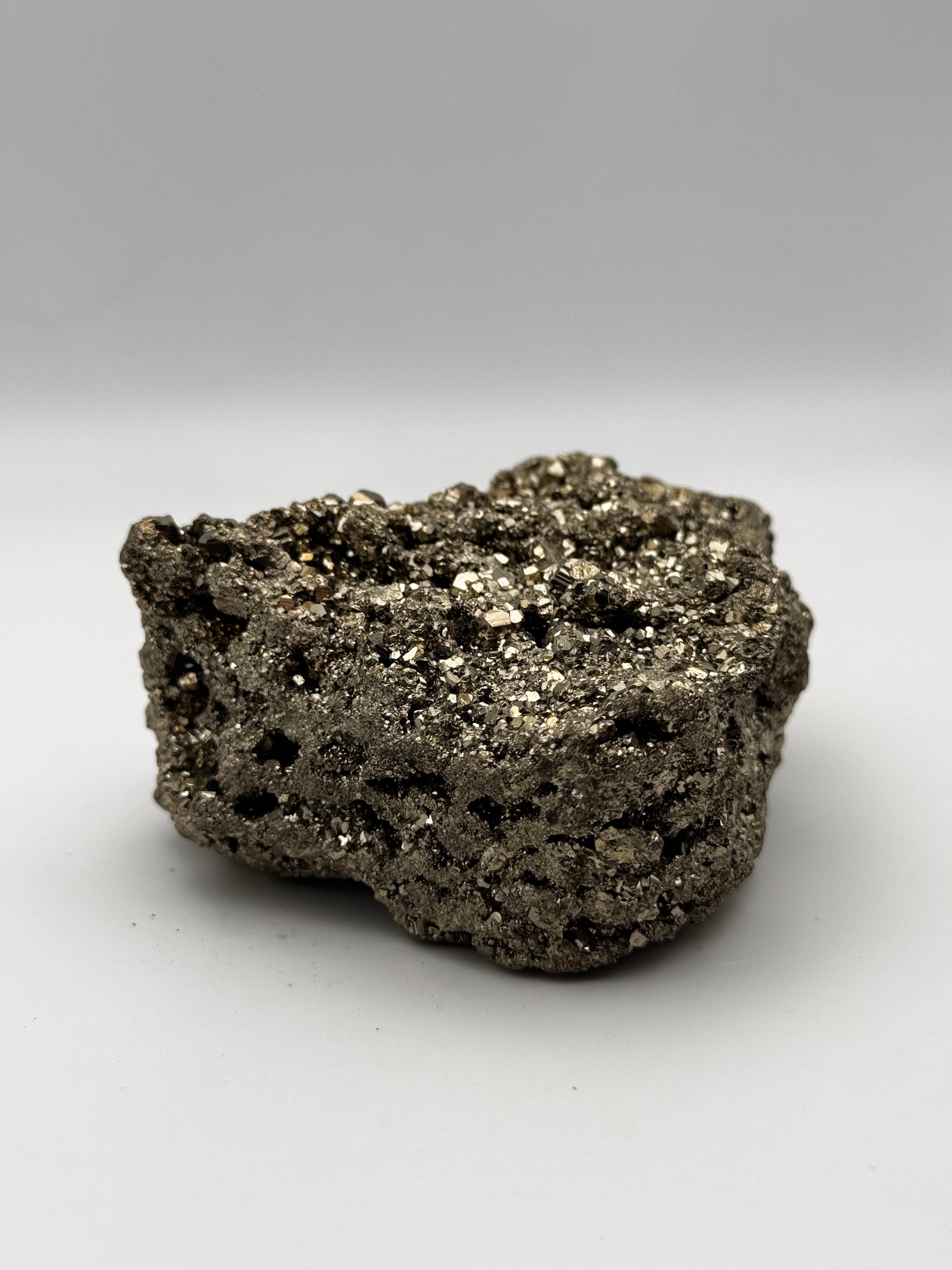 Add a touch of industrial elegance to your collection with Iron Pyrite, the stunning mineral world-renowned as "Fool's Gold." Characterized by its brilliant metallic luster and deep brassy-yellow hues, pyrite is a true marvel of natural geometry. Unlike most minerals, it often forms in perfectly sharp cubes or intricate "pyritohedron" shapes that look almost architectural. Whether you’re a serious collector looking for high-quality cubic specimens or someone seeking a bold, grounding piece for your home decor, our hand-selected pyrite crystals offer a captivating shimmer that rivals the real thing.