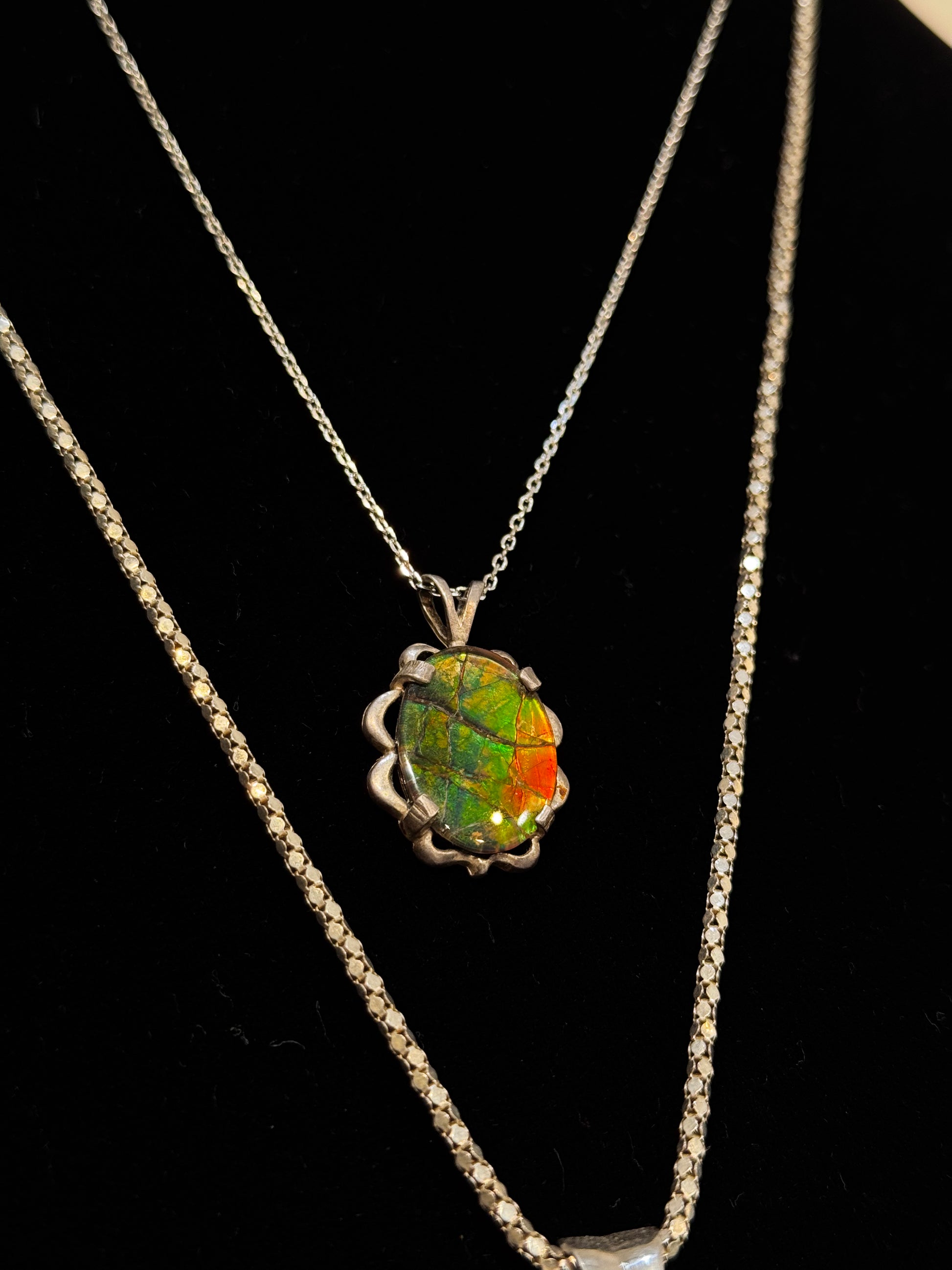 Discover the unique beauty and craftsmanship of our natural ammolite pendant. Hand-set in sterling silver, this one-of-a-kind piece is truly unmatched in quality and design. You won't find anything else like it!