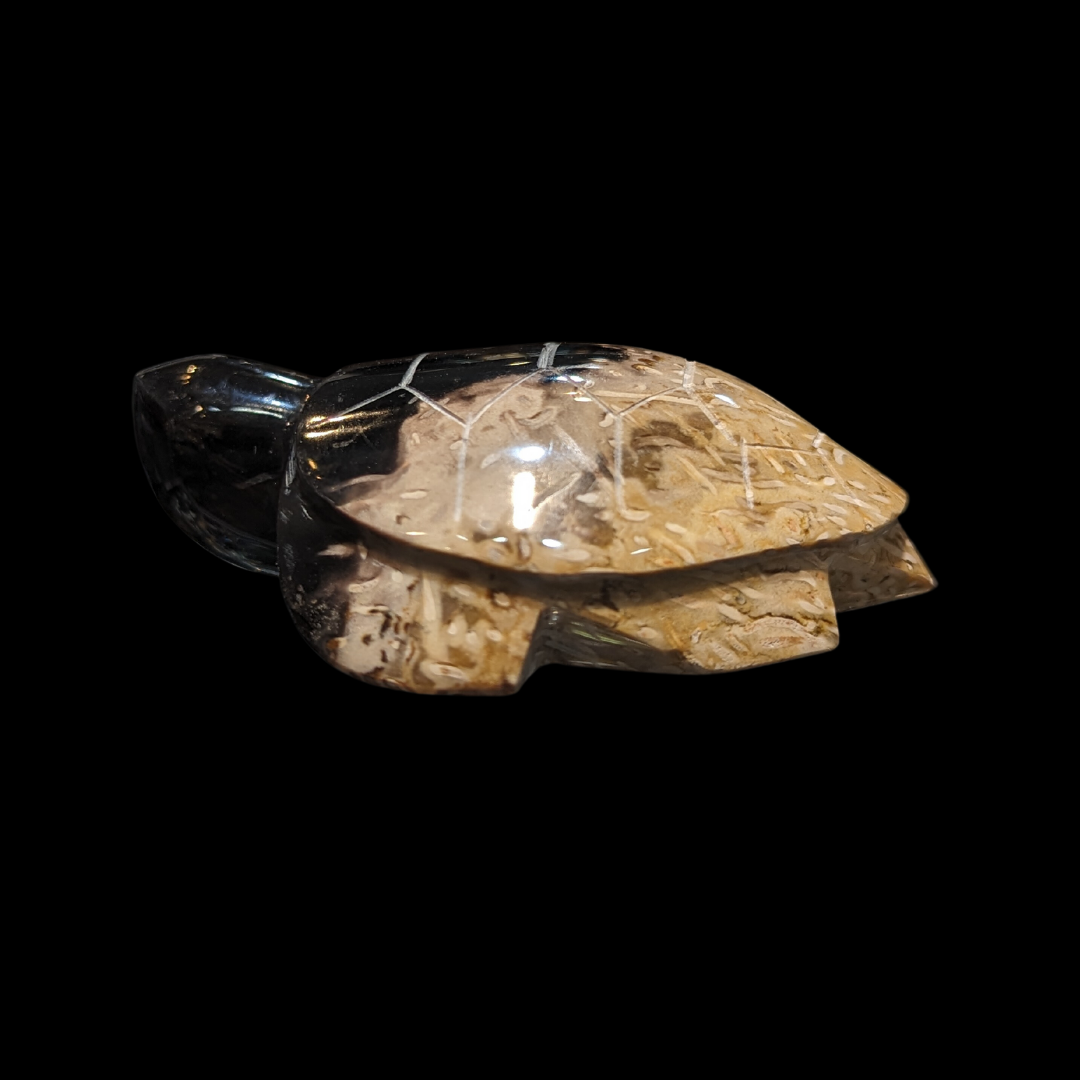 Gaze upon the magnificent patterns of petrified palm wood that grace the turtle's shell, reminiscent of the eons it took for nature to transform wood into stone. Petrified palm wood's grounding energy permeates this charming figurine, creating a sense of stability and connection to the Earth's ancient past.