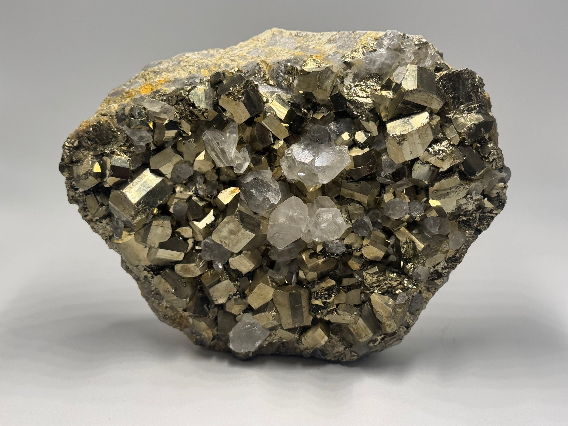 Aesthetic Contrast: The brilliant gold-toned metallic luster of the Pyrite provides a sharp visual counterpoint to the neutral, translucent Quartz.