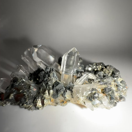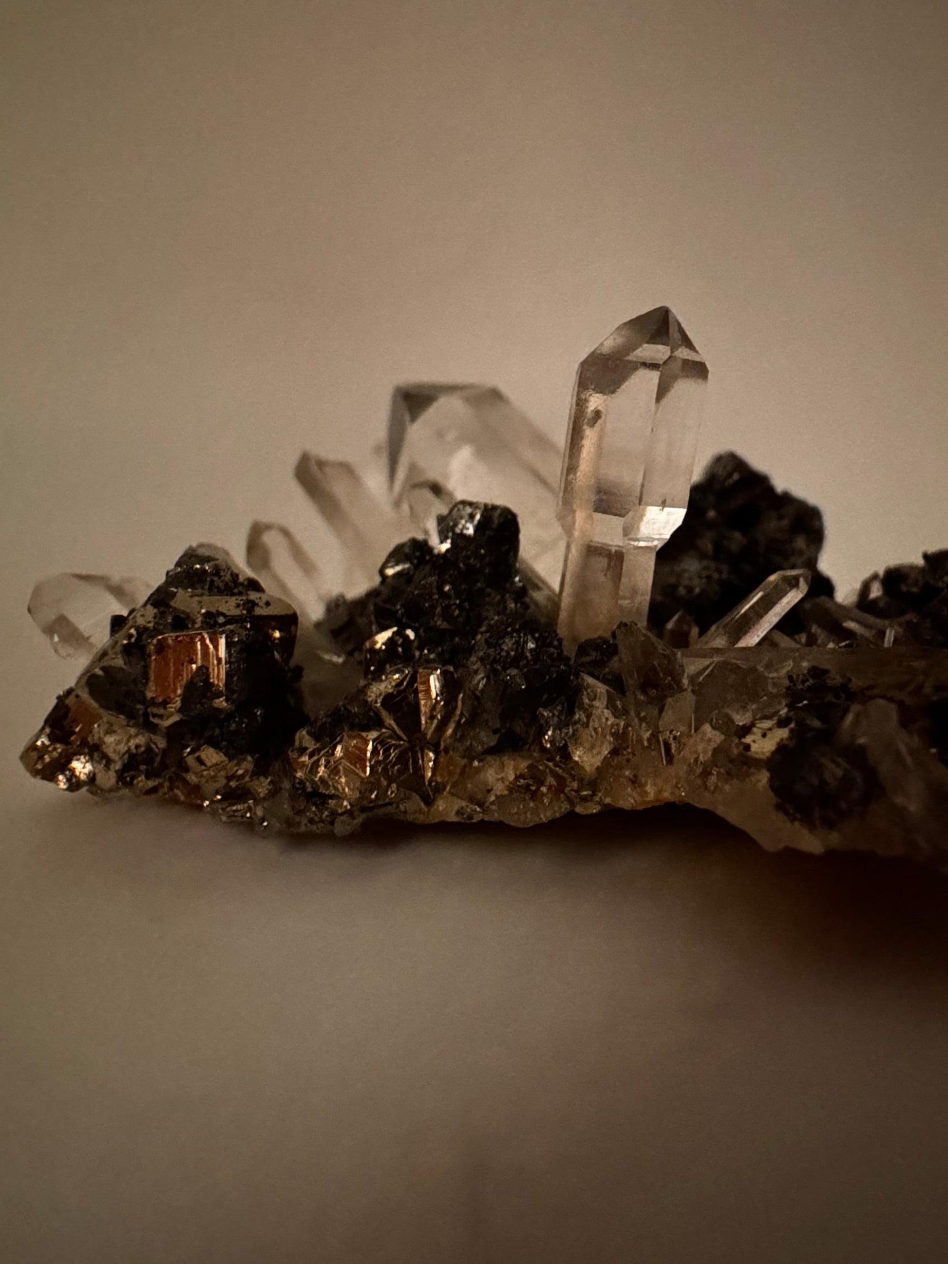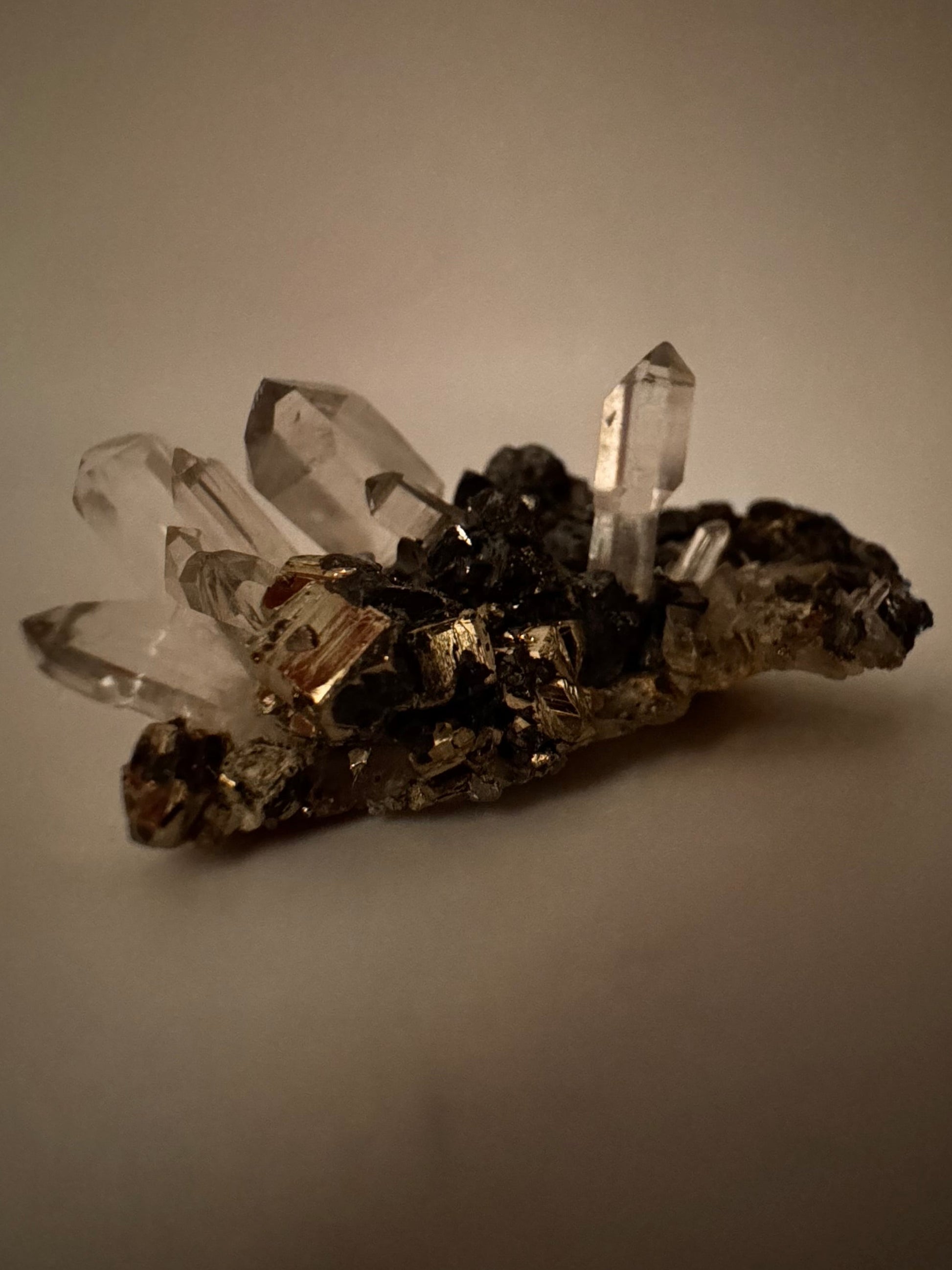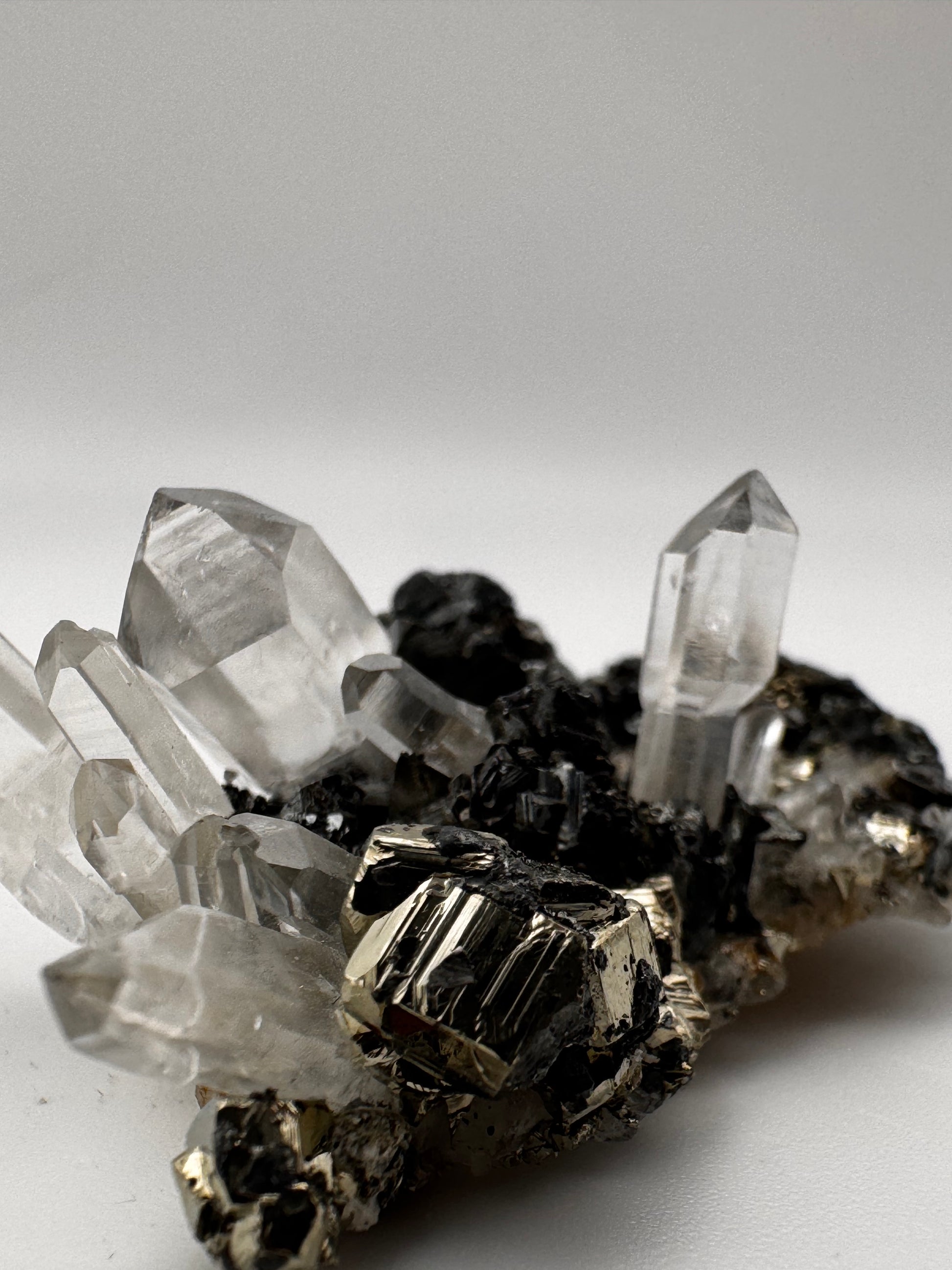 This stunning specimen comes from the world-famous Huanzala Mine, Peru, known for producing some of the brightest, mirror-like pyrite in the world. Clear, well-terminated quartz crystals rise elegantly from a sparkling bed of metallic pyrite cubes, creating a striking contrast of light and shine. A couple of quartz sceptre formations add extra character and uniqueness to the piece.